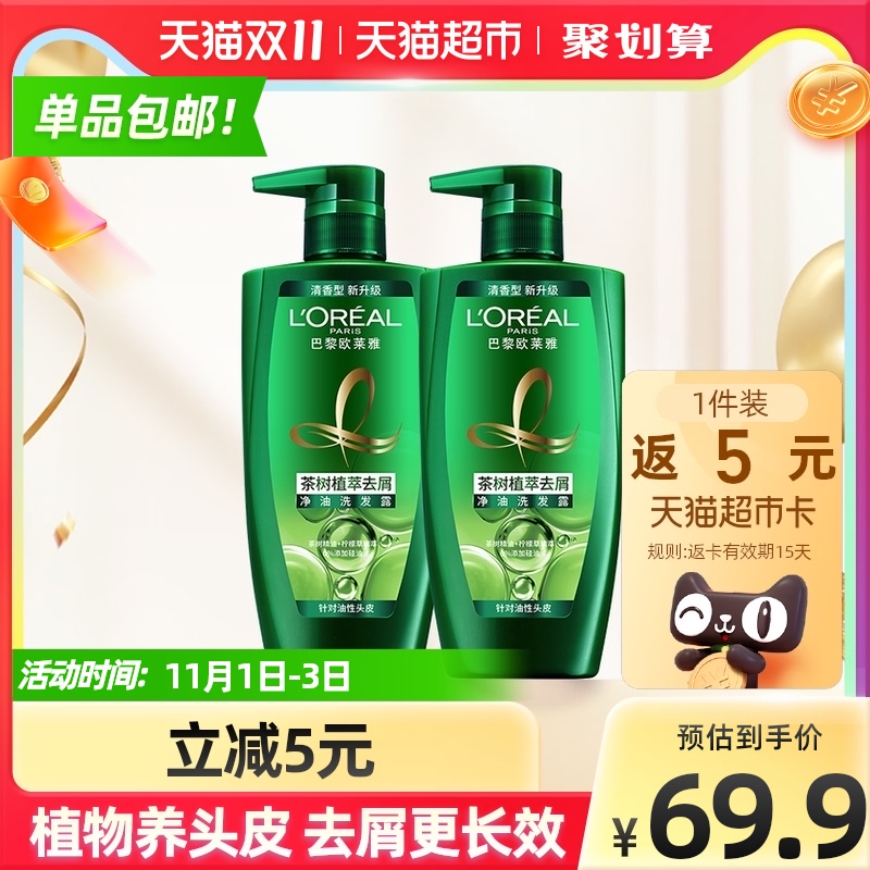 巴黎欧莱雅茶树植萃去头屑净油洗发露500ml*2植物养头发控油