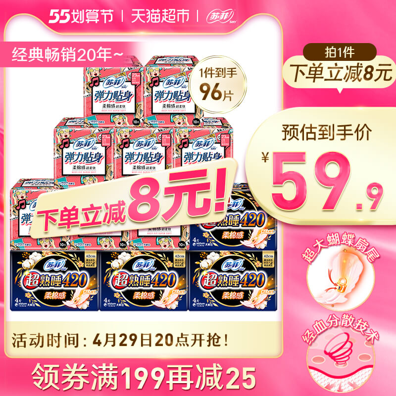 苏菲卫生巾柔棉感日用超熟睡弹力贴身夜用姨妈巾组合装96片*1箱