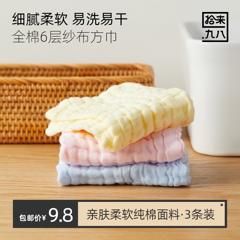 【拾来九八】小方巾纱布毛巾手帕纯棉婴儿童口水巾手绢洗脸3条装