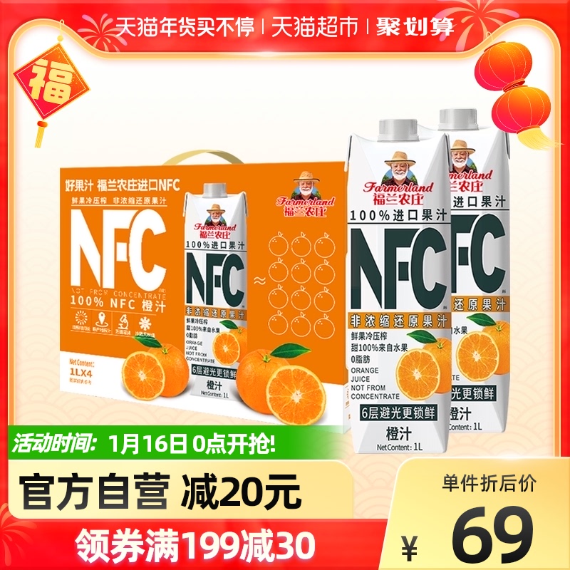 【年货礼盒】进口福兰农庄100%NFC橙汁纯果汁饮料1L*4瓶鲜果冷榨