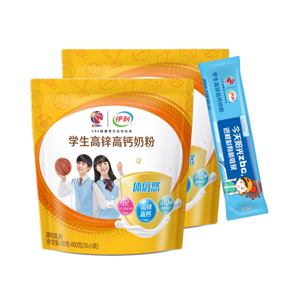 天猫超市伊利大学生青少年儿童成长高锌高钙奶粉400g*2袋装冲饮早餐奶粉益生菌 高锌、高钙
