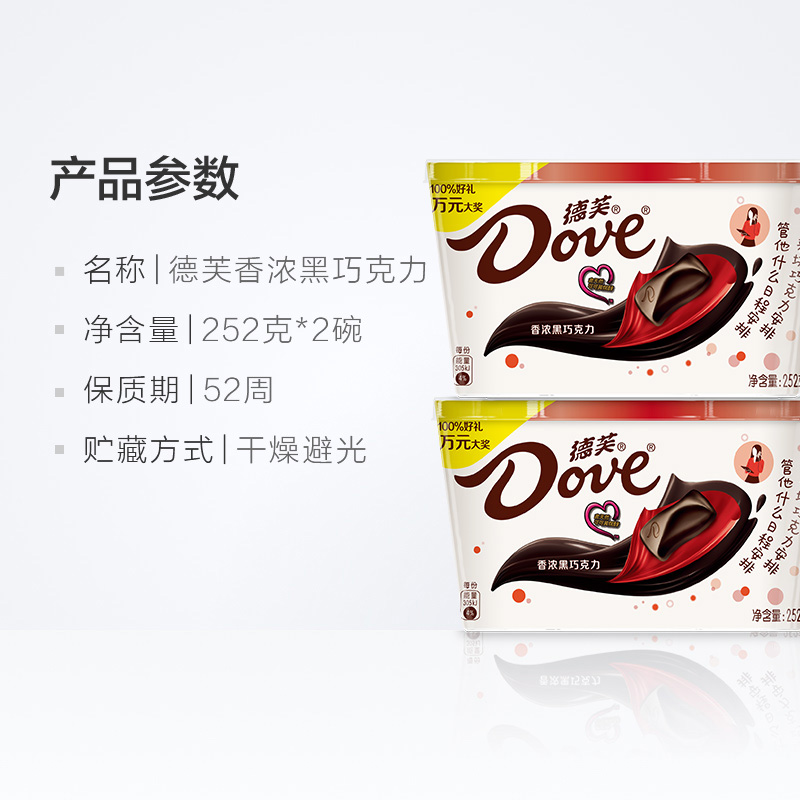 • 天猫超市德芙香浓黑巧克力252gx2碗装排块小零食情人节送女友浪漫礼物糖果01/4